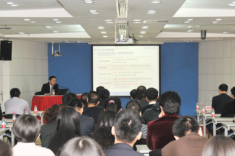張總裁在會議上做了2014年年度工作報告及2015年工作安排,全面客觀地回顧了一年來公司各項工作進展情況,發(fā)現(xiàn)問題,總結(jié)得失,并根據(jù)戰(zhàn)略規(guī)劃部署了新一年重點工作任務(wù)。2014年是公司進行戰(zhàn)略轉(zhuǎn)型的第一年,在“抓住機遇、提質(zhì)增效”的指導思想下,圍繞抓好融資結(jié)構(gòu)升級和風控手段創(chuàng)新兩個著力點,加快干部隊伍建設(shè)梯隊化和年輕化步伐,構(gòu)建了“業(yè)務(wù)行業(yè)化、融資多元化、風控專業(yè)化”的經(jīng)營新格局。