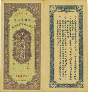 1943年國民黨政府發動第三次反共高潮,加緊對邊區實行經濟封鎖,邊區物資缺少,物價飛漲,為鞏固與穩定邊幣幣值,擴大貨幣流通范圍,1944年,邊區銀行以“陜甘寧邊區貿易公司”名義發行陜甘寧邊區貿易公司商業流通券,至1948年1月停止。